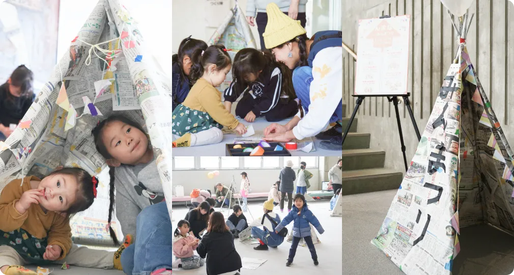 誰もが一度は「欲しい!」と憧れた子ども秘密基地。この町に“子どもまんなかの城”をつくりたい――そんな思いから新聞テント作りをしました。親子で力を合わせ、気づけば大人も夢中。完成したテントに目を輝かせて入る子どもたち。その笑顔に包まれ、あたたかく幸せな時間が広がりました。これからもワクワクあふれる居場所を育てていきます。かつて子どもだったあなたも、一緒に城づくりしませんか?